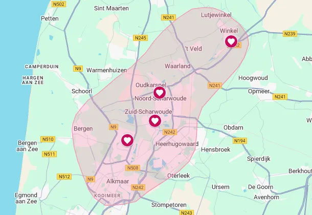 Ons verzorgingsgebied: Alkmaar, Broek op Langedijk, Heerhugowaard, Nieuwe Niedorp, Noord-Scharwoude, Oudkarspel, Sint Pancras, Tuitjenhorn, 't Veld, Waarland, Warmenhuizen, Winkel, en Zuid-Scharwoude. Val je hier net buiten? Bel ons, dan kijken we samen naar de mogelijkheden.